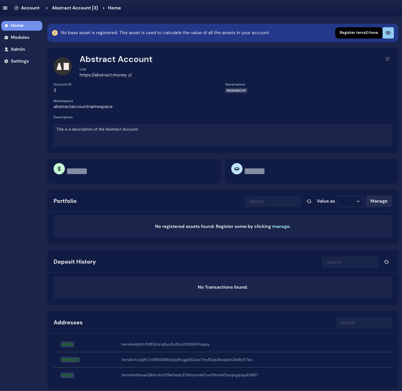 A contract that acts as a registry for all modules and accounts within the Abstract platform.